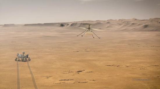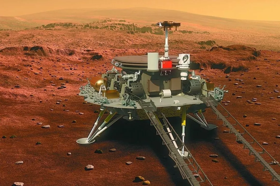 天问一号的著陆器同时搭载有祝融号火星车,可以在火星表面上行走。