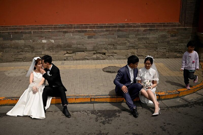 订婚的情侣上个月在北京摆姿势拍照。政府正在鼓励更多的人生孩子,以帮助避免即将到来的人口危机。 NOEL CELIS/AGENCE FRANCE-PRESSE — GETTY IMAGES