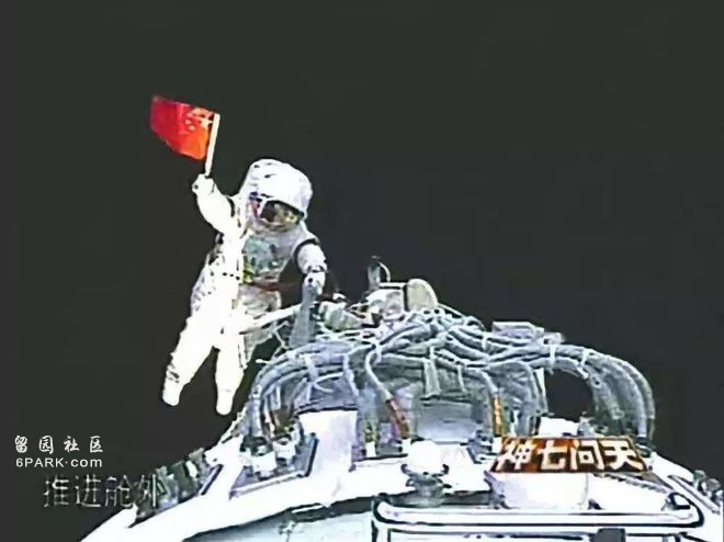 北京时间16时44分,全世界通过电视直播,看到了在黑色的宇宙帷幕之中,身着白色“飞天”航天服的翟志刚,挥舞国旗,向中国人民、向全世界人民问好。那面凝聚了航天人深情的五星红旗,在太空中无比鲜艳。