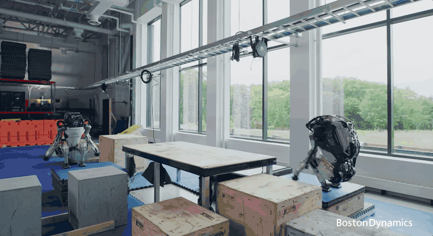 闪转腾挪间, 两台 Atlas 机器人跨越了一个又一个木箱,在视频最后甚至来了个标准的后空翻。