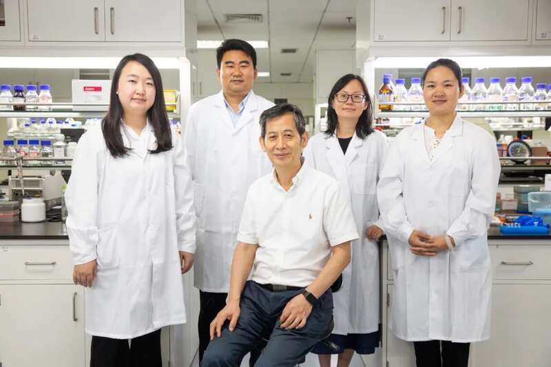 科研团队乔婧科研助理、蔡韬副研究员、马延和研究员、朱蕾蕾研究员、孙红兵科研助理(从左至右)在中国科学院天津工业生物技术研究所实验室合影(9月16日摄)。图片来源:新华社记者 金立旺 摄