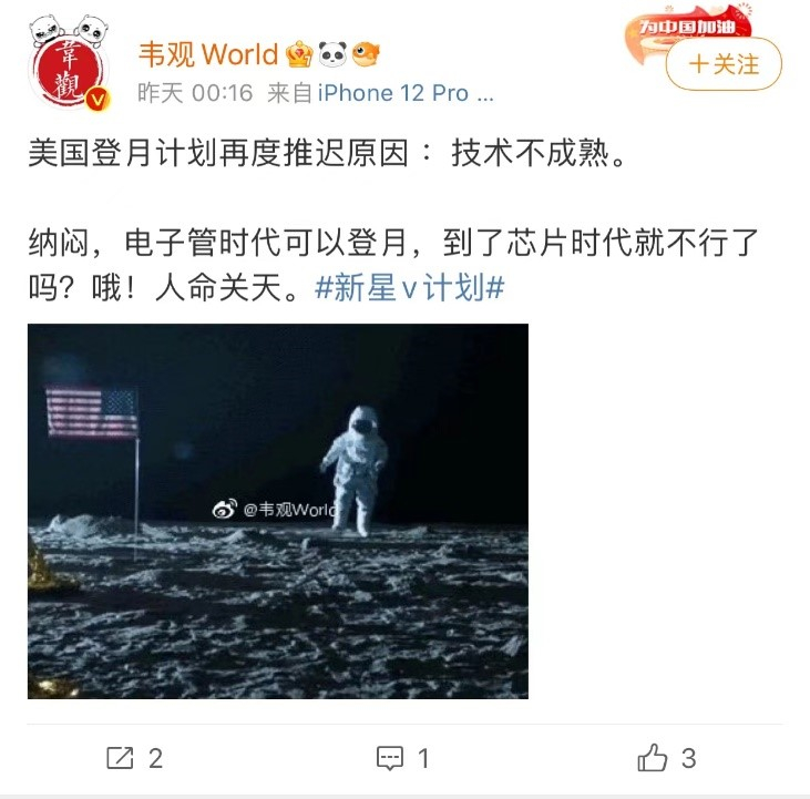 有网友进而质疑,为什么美国能在50多年前把航天员送上太空,到了“芯片时代”反而不行了呢?