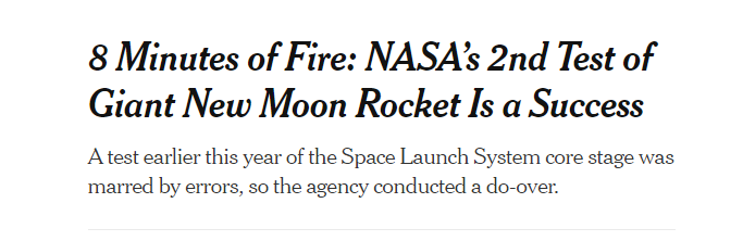 《纽约时报》在今年3月18日发表的一篇长文显示,今年1月,NASA针对阿尔忒弥斯一号关键组成部分重型运载火箭——航空发射系统(SLS)芯级进行了初次“热火”测试。试验中,由于SLS系统的一个元件出了故障,导致计算机主动关闭了发射引擎,整场点火只持续了约1分钟,远未达到原定的8分钟点火目标。