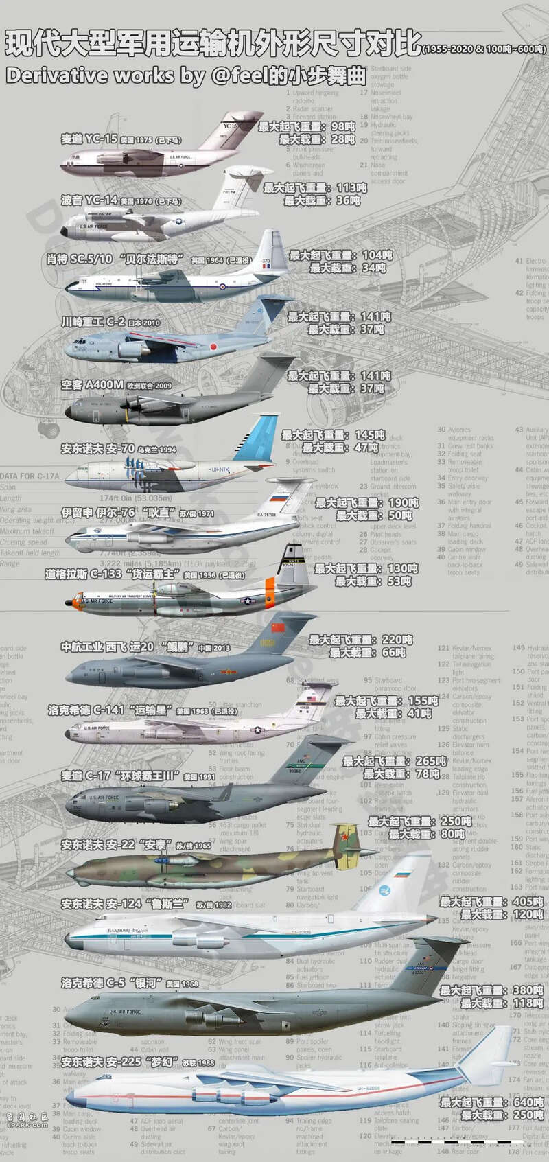 它由苏联安东诺夫设计局基于 An-124 研制,机长 84 米,翼展 88.4 米,高 18.1 米,由 6 台发动机提供动力,最大载重量 250 吨。飞机并不可以造得无限大,因为机翼在空中会因载荷而产生形变,AN-225 已经是目前人类技术的天花板。