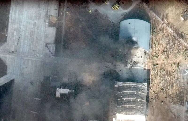 乌克兰总统泽连斯基确认了 An-225 在空袭中被摧毁的消息。照片中,An-225 所在的弧形机库下,金属板顶已经被炸穿,火焰在机库熊熊燃烧,隐约可以看到机身轮廓。