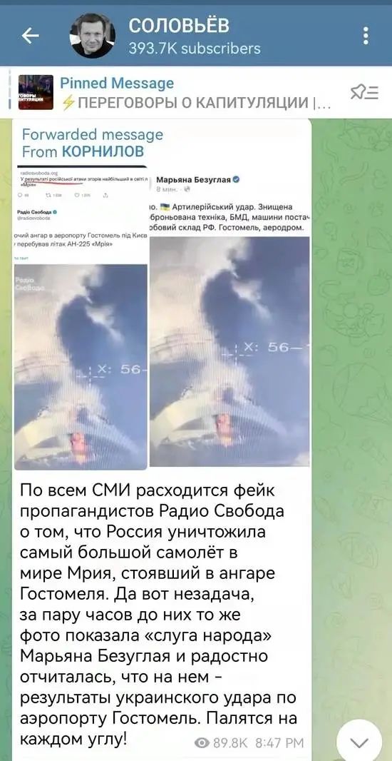 没过多久,事情又在网上发生了反转。俄罗斯著名主持人索洛维约夫辟谣称,网络大肆流传的俄军摧毁 An-225 图片是假消息。因为当天早些时候,乌克兰政界人士玛丽亚娜·贝祖格拉亚在社交媒体展示了同一张机场起火的照片,她表示这是乌克兰军方对戈斯托梅利机场攻打的结果。