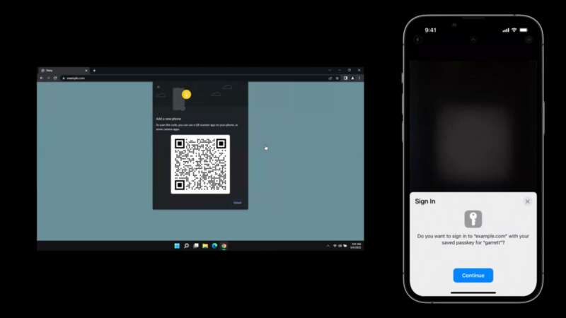 比如像苹果在 WWDC 期间展示的那样:iPhone 用户可以通过扫码,在一台 Windows PC 上,使用 Chrome 浏览器登录一个支持 FIDO 技术的账户,这样一个类似“微信扫码登录”的简单操作,更像是苹果、微软、谷歌三大互联网巨头在无密码领域努力的缩影 。