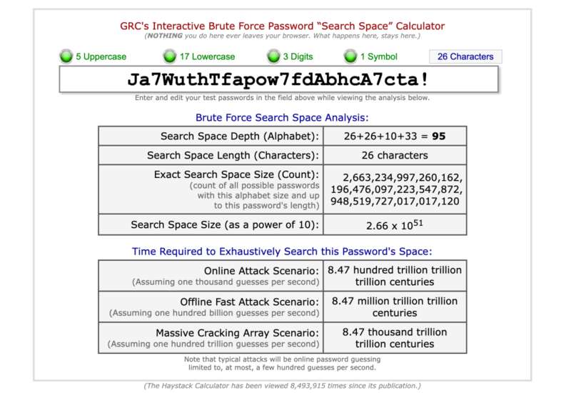 比如上图中典型的随机密码,即使使用每秒 100 万亿次浮点运算能力的超级计算机,也需要 8.47 万亿世纪才能暴力破解