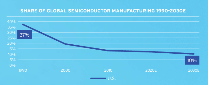 作为支柱工业之一,美国半导体工业滑落与美国的去工业化同步,在世界上的占比从90年代初的37%下降到现在的12%,预计到2030年将进一步降低到10% 图源:SIA