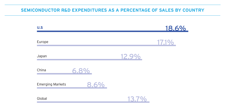 2020年各国半导体研发投资强度中,美国也领先,接近三倍于中国 图源:SIA