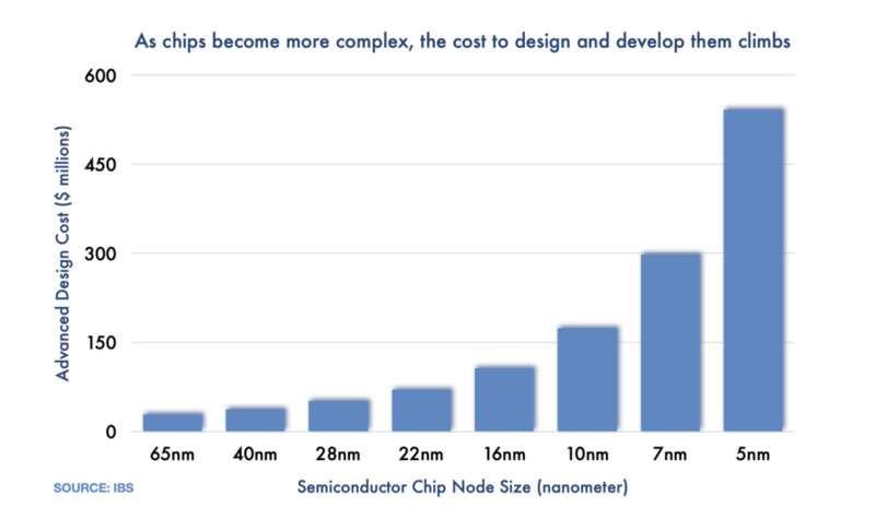 芯片的研发成本随节点尺寸的下降而急剧升高,制造成本也同步升高 图源:IBS