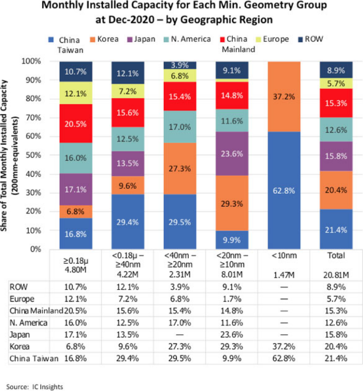根据美国半导体工业协会(SIA)2021年《行业现状》报告,在逻辑芯片(CPU、DSP等)产能方面,中国大陆在45nm以上占23%,美国9%,中国台湾31%,韩国10%,日本13%,欧洲6%,其他7%;28-45nm里,中国大陆占19%,美国6%,中国台湾47%,韩国6%,日本5%,欧洲4%,其他13%;10-22nm里,中国大陆占3%,美国43%,中国台湾28%,韩国5%,欧洲12%,其他9%;10nm以下只有中国台湾(92%)和韩国(8%)。