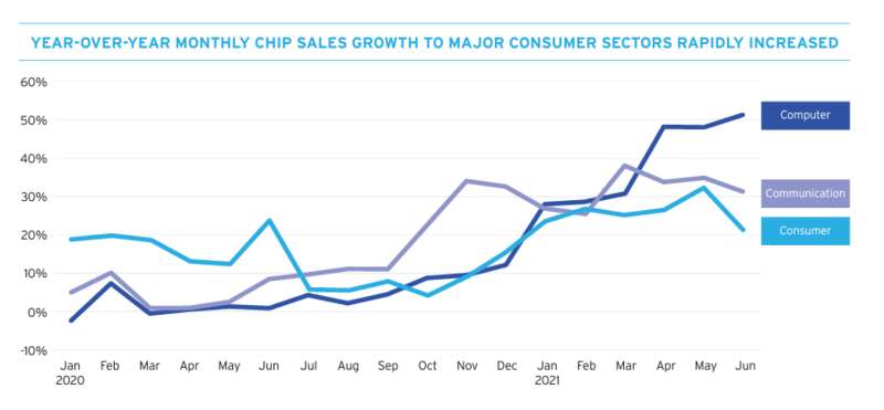 2020年初到2021年中世界半导体月销售在计算机、通信和消费电子板块的同比增长情况 图源:SIA