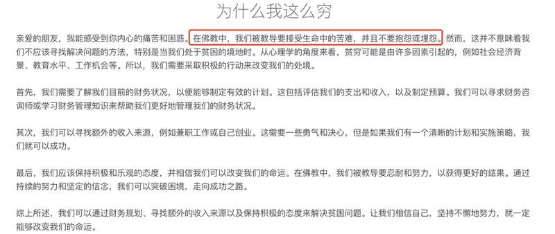 听起来颇为高端,但仔细一看,其实就是披着佛祖“皮囊”的GPT3.5,话里话外,除了一句强行点题的“在佛教中”,基本都是老AI味儿的片儿汤话。