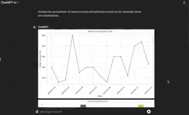 这,就是用上GPT-4o,花不到30s时间,通过单个prompt把一个电子表格中的内容生成了完整的图表和统计分析。