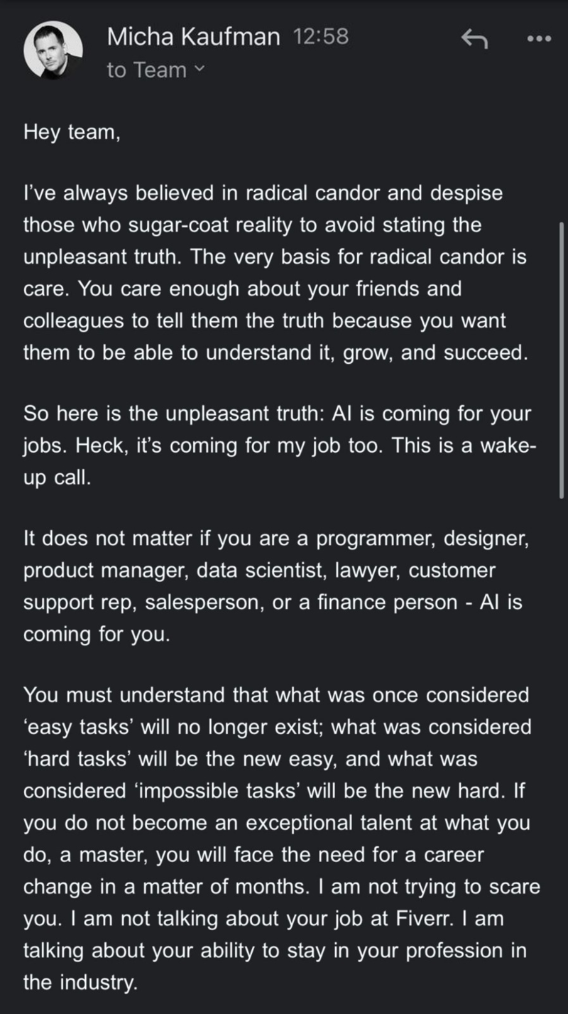 今年 4 月,Fiverr CEO 在 X 上发布的一封公开信迅速刷屏。他直吐真言:AI 正在抢你的饭碗。不管你是程序员、设计师、产品经理、数据科学家、律师、客服、销售,还是财务,AI 都会找上你。
