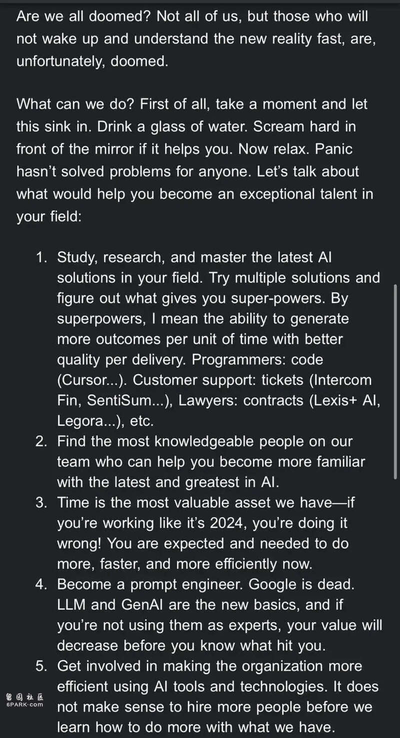 你可以把时间用在非线性的思考上,可以参与公司的战略讨论。其实我自己也是在写那封邮件时,才突然意识到一个很重要的点:当我们真正理解 AI 是怎么扩展我们的能力、改变我们的工作方式,它其实也在倒逼我们重新认识什么是“人”的价值。