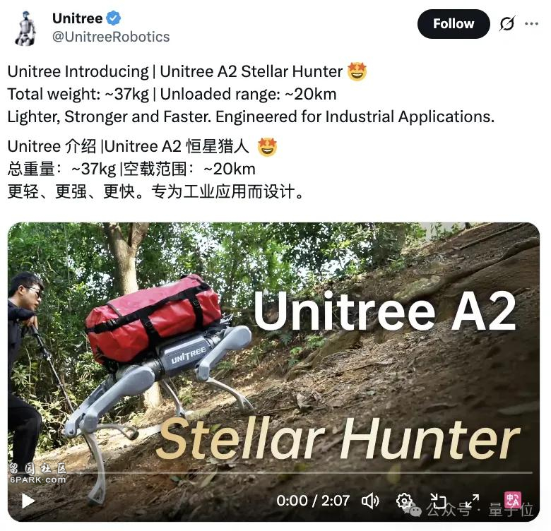 能轻松扛起成年男子全新登场的Unitree A2星际猎影,整机约37kg,空载续航20km,相当于绕操场狂奔50圈。