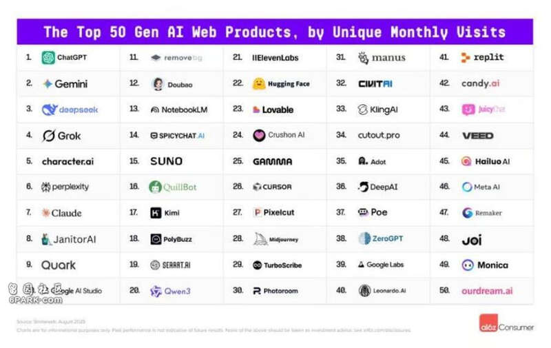 Google在前50名网站中还有其他三个工具:AI Studio(第10名)、NotebookLM(第13名)和Google Labs(第39名)。