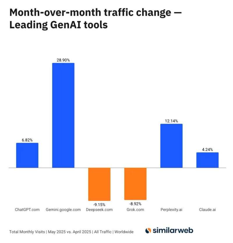 更令人瞩目的是增长数据。Gemini的增长轨迹非常陡峭,网站访问量从2月份的2.84亿次增长到7月份的7亿次,而ChatGPT为57.2亿次。