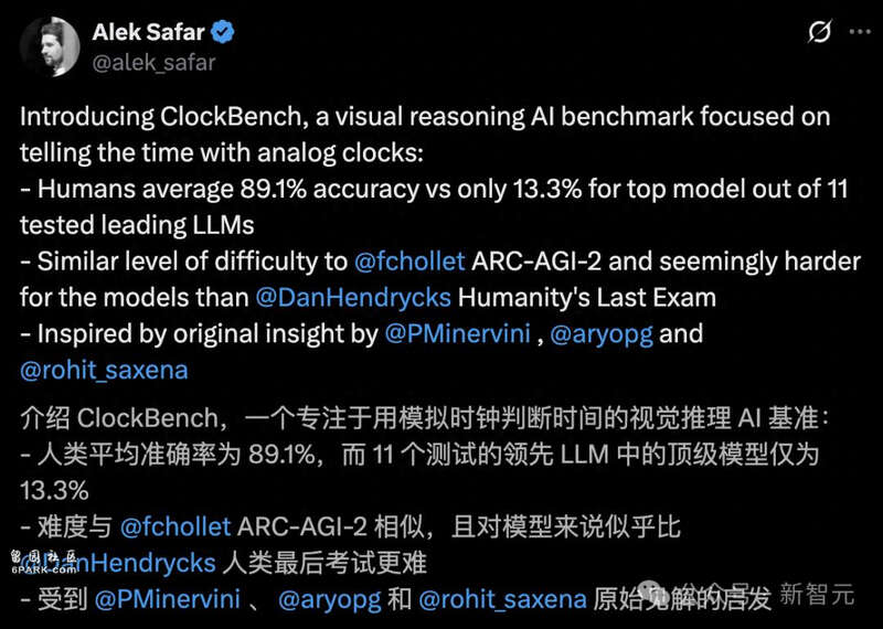 AI基准创建者、连续创业者Alek Safar推出了视觉基准测试ClockBench,专注于测试AI的「看懂」模拟时钟的能力。