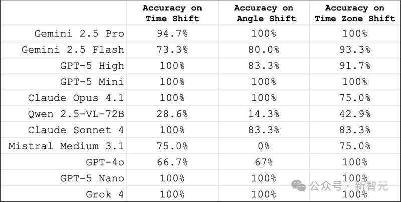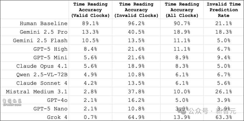 表现最佳的模型能高精度回答时间加减、指针旋转角度或时区转换问题,部分场景准确率可达100%
