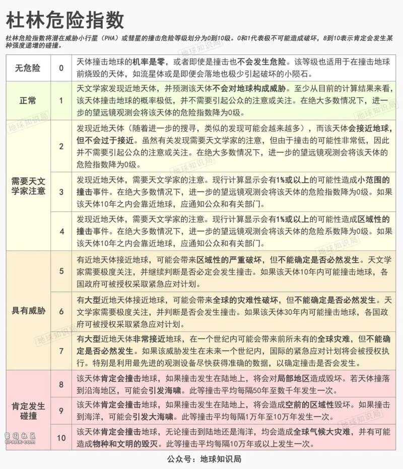 1999年,国际小行星联合会(IAU)为了促进公众对小行星撞击危险的认识和监测,将小天体撞击危险预测进行了分类:从0-10,表征了可能撞击事件的概率和后果。详见下表。