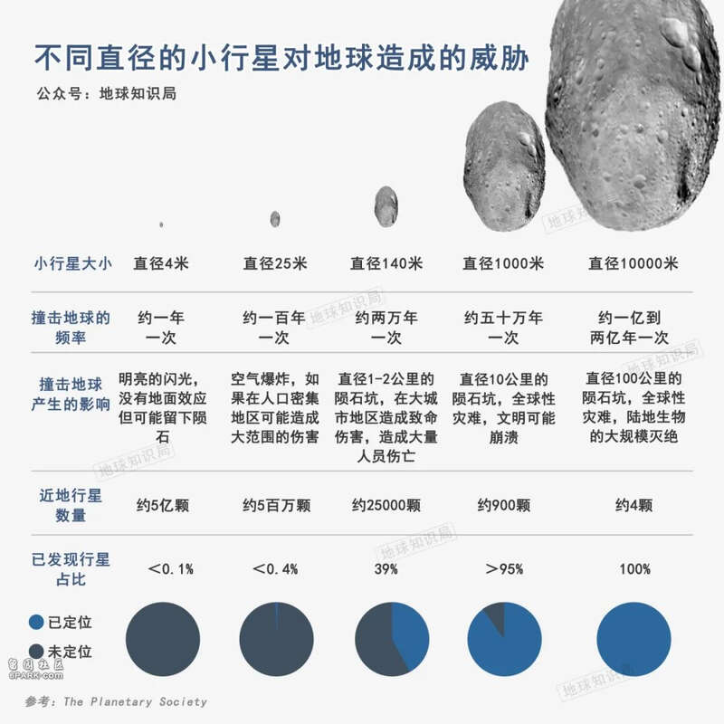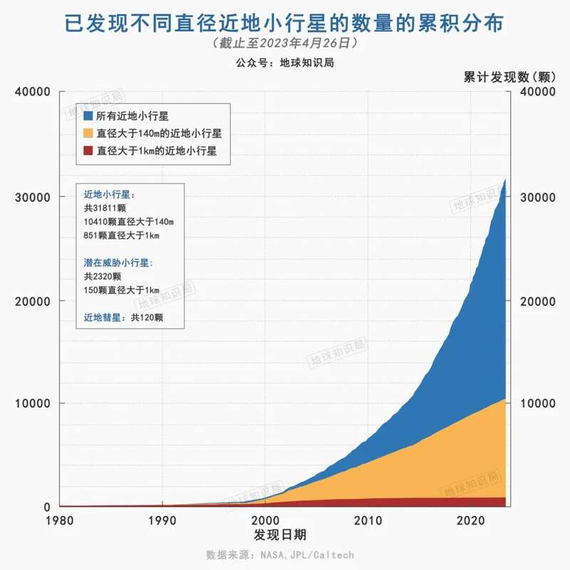 目前,我们对直径大于1km的近地小行星的观测较为完备;还有大量直径小于1km的近地小行星未被观测到,未被观测到的小行星中存在大量潜在威胁的小行星。