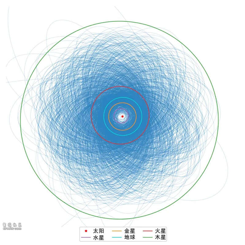 目前已发现的2320颗潜在威胁小行星的轨道分布图