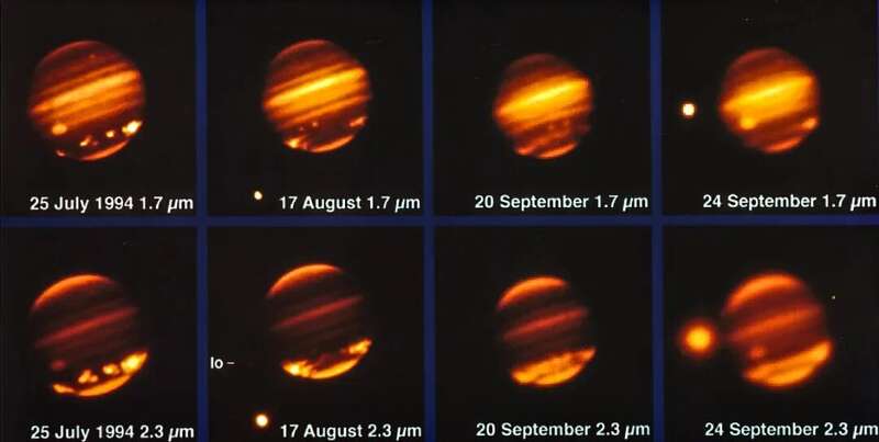 1994年7月,舒梅克·列维9号彗星撞击木星,在木星上撞击的影响半径相当于地球大小,彼时用民用小口径望远镜也可看到。