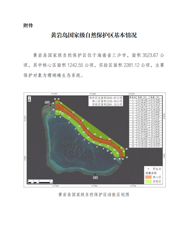 国务院已批准新建黄岩岛国家级自然保护区。根据《中华人民共和国自然保护区条例》有关规定,现将黄岩岛国家级自然保护区的面积、范围及功能区划予以公布。