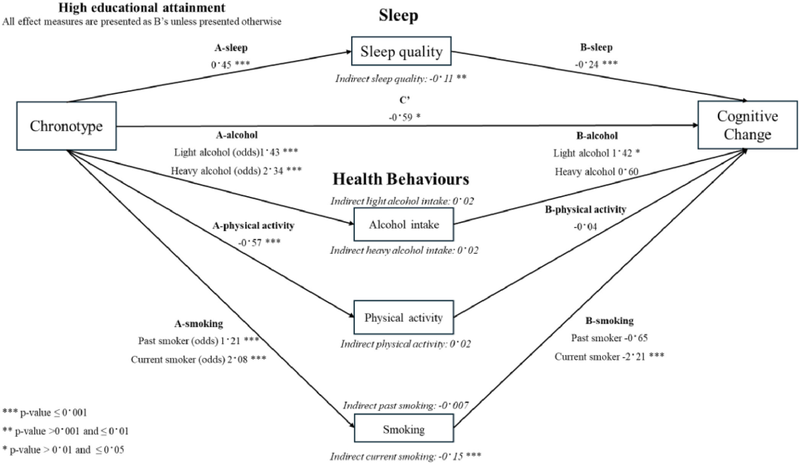 研究人员认为,在高学历者里,晚型作息与认知下滑有关,部分通过睡不好与继续吸烟这两条通道发生;而运动与酒精不是主要路径,但并不据此鼓励饮酒。
