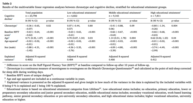 表2中显示了变量相关性。该研究证实,长期晚睡,会让认知更容易下降。