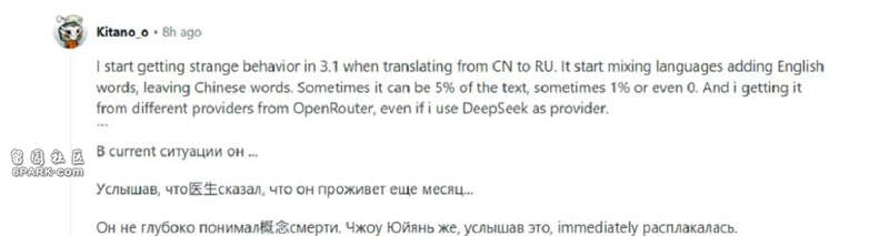 网友分享DeepSeek-V3.1多语言混用问题(图源:Reddit @Kitano_o)