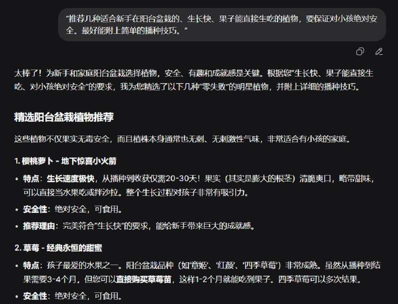 在搜索智能体能力方面,我们让DeepSeek-V3.1-Terminus推荐了几款适合新手阳台盆栽的植物。这一测试考察模型能否找出完全符合“阳台盆栽”、“生长快”、“可生食”、“对儿童安全”所有条件的植物。此外,模型也要交叉验证信息的可靠性,并进行整合提炼和风险提示。
