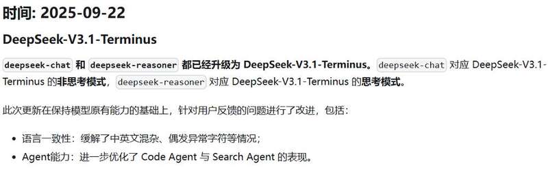 智东西9月22日报道,今天晚间,DeepSeek在其官方API平台发布了最新升级的DeepSeek-V3.1-Terminus模型(Terminus拉丁语意为终点、界限),并在不久后宣布模型开源。
