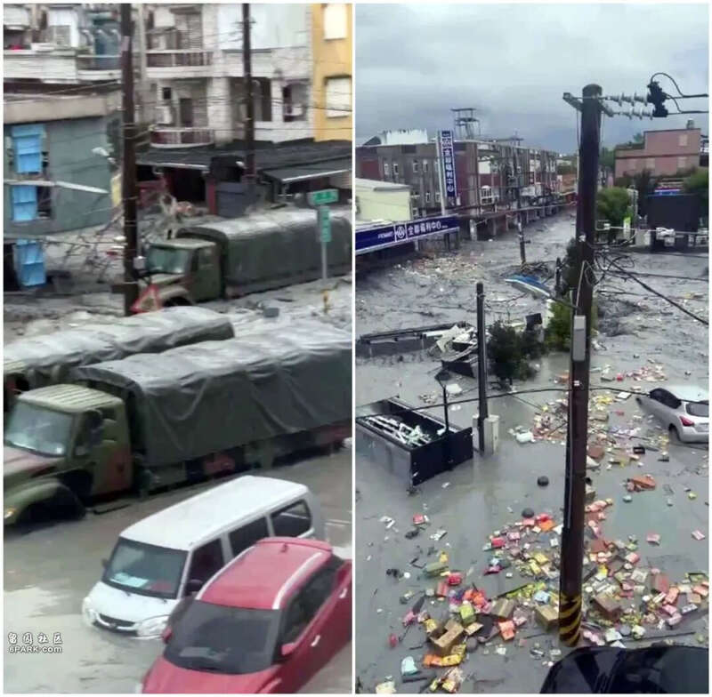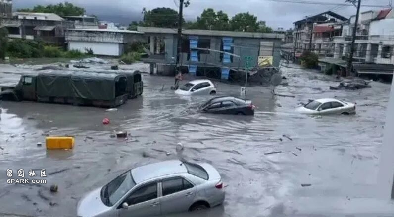 现场画面令人窒息:浑浊的泥流灌入街道,水深一度高达数米,一层楼高的民宅被完全夷平;大量汽车被卷走漂浮,甚至包括多辆用于救灾的台军军用卡车;