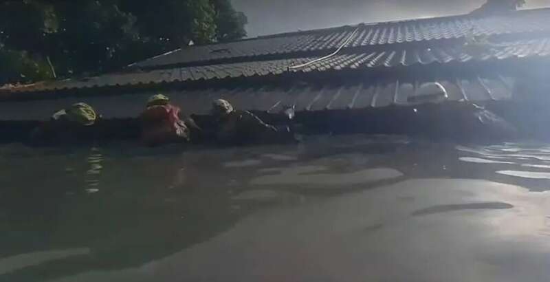 居民被迫爬上屋顶避难,有妇人腰部以下浸在水中,只能死死抱住柱子以防被冲走。