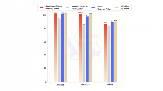 Qwen3-Max的推理增强版本Qwen3-Max-Thinking-Heavy也展现出非凡性能,结合工具调用和并行推理技术,其推理能力创下新高,尤其在聚焦数学推理的AIME 25和HMMT测试中,均达到突破性的满分100分,为国内首次。Qwen3-Max推理模型之所以能够取得优异成绩,原因在于大模型在解数学题时懂得调动工具,能够写代码做题,同时,增加测试时的计算资源,也让模型表现变得更好。