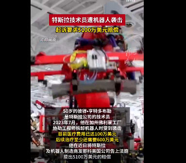 一名特斯拉(Tesla)技术员在工作期间被有故障的机器人袭击,身受重伤。目前医疗费用已达100万美元,后续治疗至少还需要600万美元。他在近日将特斯拉及其供货商告上法庭,提出5100万美元的赔偿。