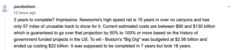 还有网友用问号表达“难以置信”:“三年竣工?令人惊叹。反观纽森主导的高铁项目,推进15年未跨越任何峡谷,仅建成57英里无法通车的轨道。目前的预估成本在 900 亿至 1350 亿美元之间——参照美国政府资助项目的过往记录,最终实际支出几乎注定会超出预估的50%到100%甚至更多。典型案例是波士顿的‘大隧道工程’:最初预算25.6亿美元,最终耗资220亿美元。原计划7年完工,实际耗时16年。”↓