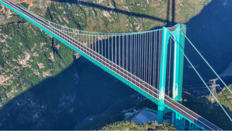 花江大峡谷被称为“地球裂缝”,花江峡谷大桥是贵州六枝至安龙高速公路的控制性工程。大桥全长2890米,可将两岸通行时间从两个多小时缩短到两分钟左右。花江峡谷大桥钢桁梁吊装有93个节段,总重达2.1万吨,需在600多米高空实现毫米级精准对接。建设团队借助研发的“智慧缆索吊装系统”,全部吊装仅用了73天就全面完成;3.8万平方米的桥面,建设团队在1个多月里完成了5层铺装……