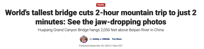 “世界第一高桥将2小时的山路车程缩短至2分钟:来欣赏令人惊叹的照片”——美国福克斯新闻网以此为题,介绍了贵州花江峡谷大桥。
