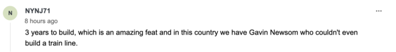 “三年建成,真是一项惊人的成就。而在我们这个国家,(加州州长)纽森甚至都搞不定一条铁路线的修建。”↓