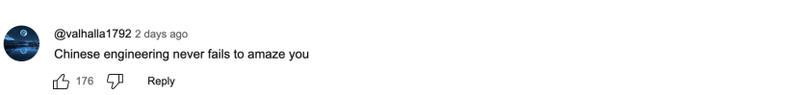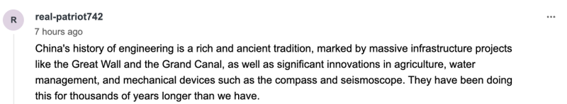 还有网友称,“中国工程史源远流长”,并提到了长城、大运河,以及指南针和地震仪等等创新,“他们在这些领域已经耕耘了数千年,比我们长得多。”↓