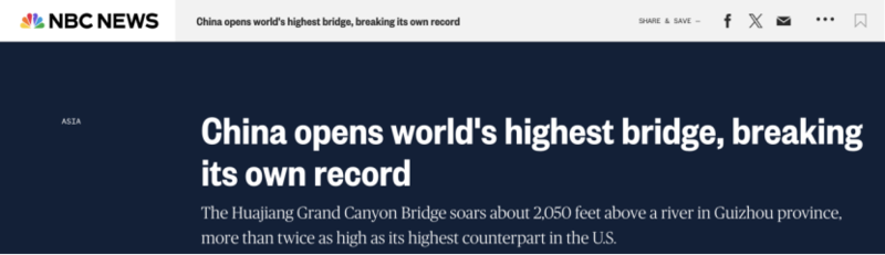 美国全国广播公司(NBC)在报道中称,中国建造的世界第一高桥通车,打破此前由中国自己创造的纪录。报道还提到,贵州花江峡谷大桥的高度,是位于科罗拉多州的美国第一高桥皇家峡谷大桥的两倍还多。