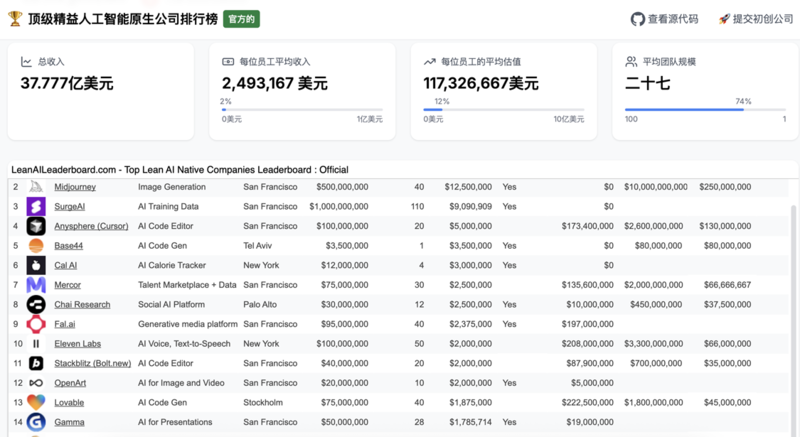在海外,一份“顶尖精益AI 原生公司”的榜单颇受关注,该榜单长期追踪团队规模较小、但营收可观的初创公司,以衡量我们距离“一人十亿美元”创业现实还有多远,在榜单中,44家公司的平均团队规模为27人,但年度总收入达到近38亿美元,单个员工的估值超过1亿美元。