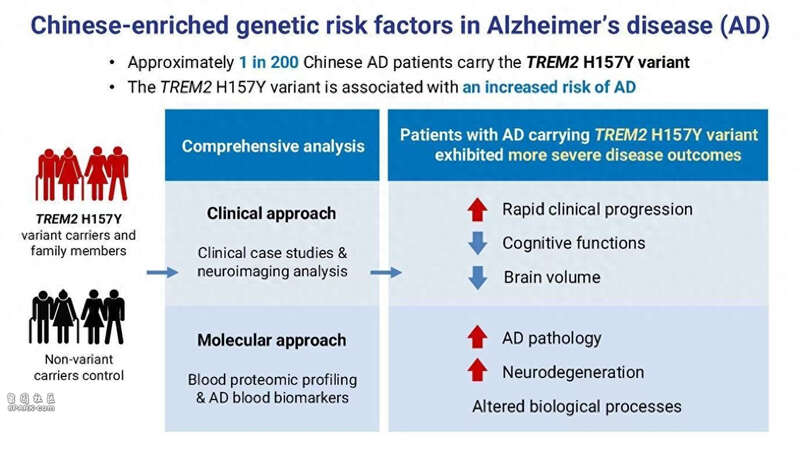 临床个案研究显示,与非携带者相比,同时带有TREM2H157Y遗传变异及APOE-ε4风险因子的患者,在早期阶段临床病情恶化速度更快。认知评估、神经影像学及阿尔茨海默病血液生物标志物分析显示,携带TREM2H157Y遗传变异的阿尔茨海默病患者,其认知功能衰退更显著、神经退行性病变更严重,以及阿尔茨海默病病理更为严重。
