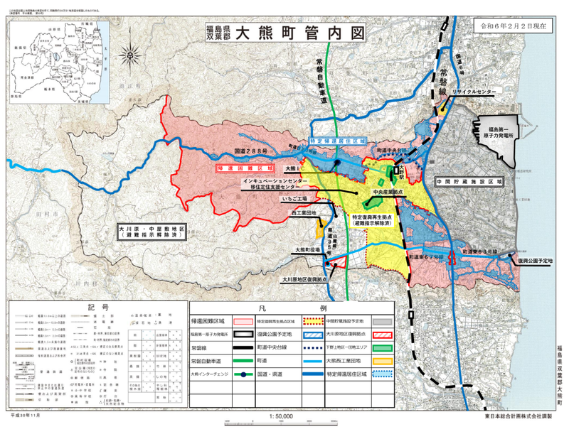 红色范围内即为“归还困难区域”。此外图中靠右侧的灰黑色区域则是福岛核电站和存放被辐射污染的水和土壤的储藏区域。图中仅为大熊町的相关区域地图,北部、南部还有更多区域目前处于封锁当中。