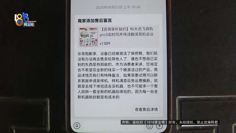 丛先生:它的7天无理由退款是虚拟的、虚假的。电子产品是激活以后不能退款,那我就提出异议了,无论任何电子产品,包括手机、耳机和电脑,你不激活怎么用?不用怎么知道好不好用。他是要求我们寄回检测,那我寄回检测,我下的是软件,那我把这耳机都寄回去以后,我手机要寄过去吗?那检测的话他用其它手机下载软件,用好用的话,那我这个还是没解决问题。当时它系统上也是假一罚十,我也不要假一罚十,我们就退货就好了。但是他就满足不了。